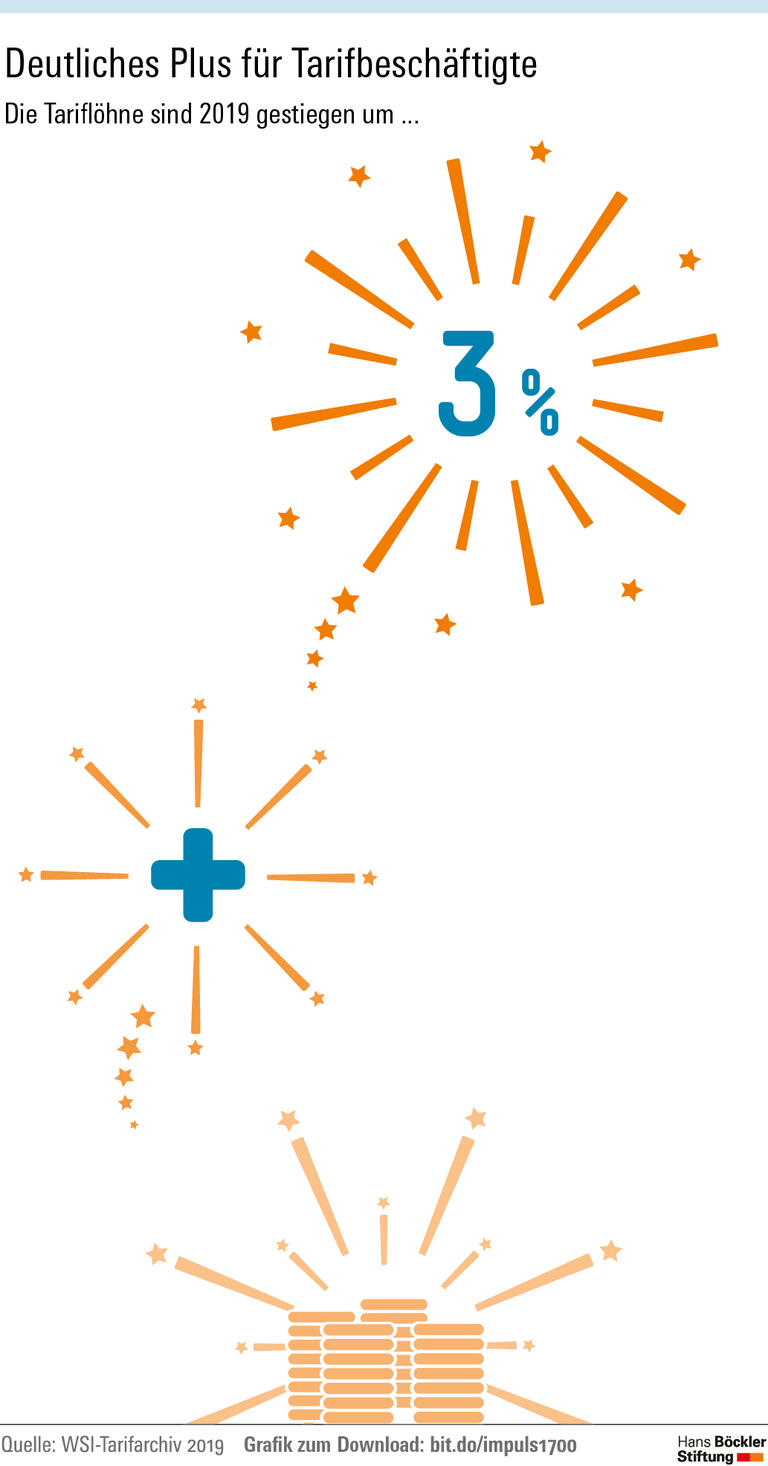 Die durchschnittlichen Tariferhöhungen entsprechen 2019 exakt dem Wert des Vorjahres. Berücksichtigt man nur die Neuabschlüsse aus dem Jahr 2019, fallen die Lohnzuwächse mit 2,5 Prozent allerdings niedriger aus. Die bereits in den Vorjahren vereinbarten längerfristigen Lohnabschlüsse schlagen 2019 im Schnitt mit einem Plus von 3,3 Prozent zu Buche. Insgesamt haben etwa 20 Millionen Beschäftigte Tariferhöhungen erhalten, davon acht Millionen in Form von Neuabschlüssen. Etwa zwölf Millionen haben von mehrjährigen Tarifabschlüssen aus den Vorjahren profitiert.