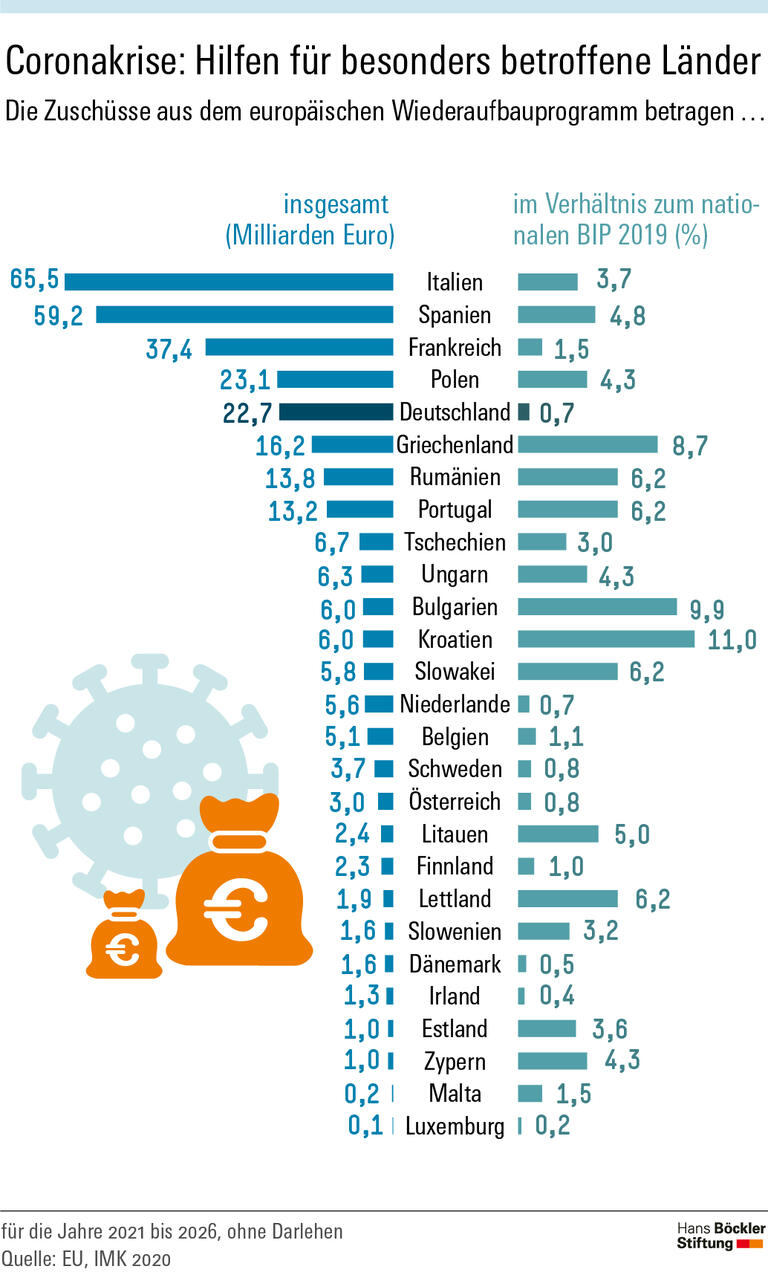 Mit ihrem Wiederaufbauplan will die EU zwischen 2021 und 2026 insgesamt 750 Milliarden Euro mobilisieren. Das Kernstück bildet die sogenannte Recovery and Resilience Facility mit einem Volumen von 672,5 Milliarden Euro. Ein Teil des Geldes, 360 Milliarden Euro, wird den Mitgliedsstaaten in Form von Darlehen zur Verfügung gestellt. Die Schulden sollen ab 2028 bis 2058 schrittweise beglichen werden. Weitere 312,5 Milliarden Euro erhalten die Staaten als Zuschüsse. Nach dem Aufteilungsschlüssel bekommen die süd- und osteuropäischen Länder – gemessen an ihrem Bruttoinlandsprodukt (BIP) – mehr Direkthilfen als Länder im Westen und Norden. Da die Bedingungen der Darlehen noch unklar sind, haben die IMK-Ökonomen in ihrer Analyse nur die makroökonomischen Effekte für den Teil des Programms berechnet, der als Zuschuss ausgezahlt wird.