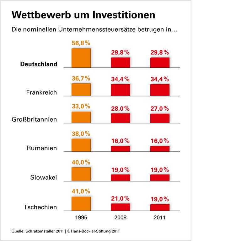 Längerfristig weisen die nominalen Steuersätze einen klaren Abwärtstrend auf. Gleiches gilt für die effektiven Durchschnittssteuersätze und die effektiven Grenzsteuersätze, die insbesondere für Standortentscheidungen und Investitionen relevant sind. Nach Berechnungen des Zentrums für Europäische Wirtschaftsforschung sind beide von 1998 bis 2008 in den alten und noch stärker in den neuen EU-Ländern gesunken.