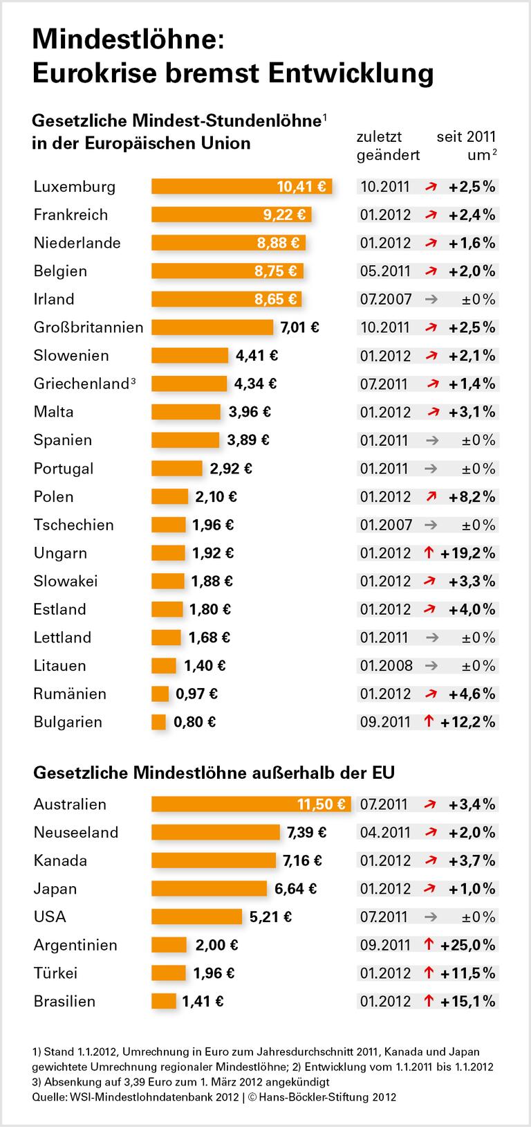Wo es Erhöhungen gab, fielen sie meist geringer aus als in den Vorjahren. Da gleichzeitig auch noch die Inflation stieg, waren die realen Zuwächse bestenfalls bescheiden. In mehreren Ländern zehrte die Teuerung die nominale Anhebung sogar auf. Das geschah nach Schultens Auswertung beispielsweise in den Niederlanden, Belgien oder Großbritannien. Einige Staaten haben ihre Lohnminima eingefroren. In Irland wurde der Mindestlohn zunächst um einen Euro gesenkt, nach dem Regierungswechsel im Sommer 2011 dann wieder auf den alten Stand von 8,65 Euro angehoben. Die griechische Regierung hat auf internationalen Druck eine Kürzung um mehr als 20 Prozent beschlossen. Es gab allerdings auch Ausnahmen, zeigt Schulten: Ungarn, Polen und Bulgarien erhöhten ihre Lohnminima real deutlich. Auch einige Länder außerhalb der EU hoben ihre Mindestlöhne spürbar an, darunter Argentinien, Brasilien und die Türkei.