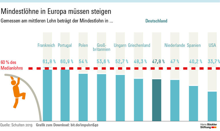Gegen diesen Missstand könnte Schulten und Müller – zufolge eine Orientierung am sogenannten Living Wage helfen – der Lohn, der zum Leben reicht. Das Konzept beruht auf einer Initiative, die 1994 in Baltimore im US-Bundesstaat Maryland begann. Dort erreichte eine breite soziale Bewegung gegen „Armut trotz Arbeit“, der unter anderem Gewerkschaften und Kirchen angehörten, dass Unternehmen, die öffentliche Aufträge oder Fördergelder bekommen wollten, nicht nur den Mindestlohn, sondern den über 70 Prozent höheren Living Wage zahlen mussten. Viele Städte und einige US-Bundesstaaten folgten diesem Beispiel. In Großbritannien zertifiziert die Living Wage Foundation Unternehmen, die freiwillig Löhne zum Leben zahlen. Deren Niveau liegt in London um 30 Prozent, im übrigen Land um 10 Prozent über dem nationalen Mindestlohn. Zum Teil erfolgreiche Initiativen für substanzielle Erhöhungen der Mindestlöhne auf Living-Wage-Niveau gebe es inzwischen in fast allen europäischen Ländern, so die Forscher. So wurde in Spanien die Lohnuntergrenze kürzlich um 22 Prozent angehoben, die konservative britische Regierung hat eine kräftige Erhöhung bis 2020 versprochen. In Deutschland spiegele sich die Debatte vor allem in der etwa vom DGB erhobenen Forderung nach einer substanziellen Erhöhung des Mindestlohns auf 12 Euro pro Stunde wider, so die Wissenschaftler.