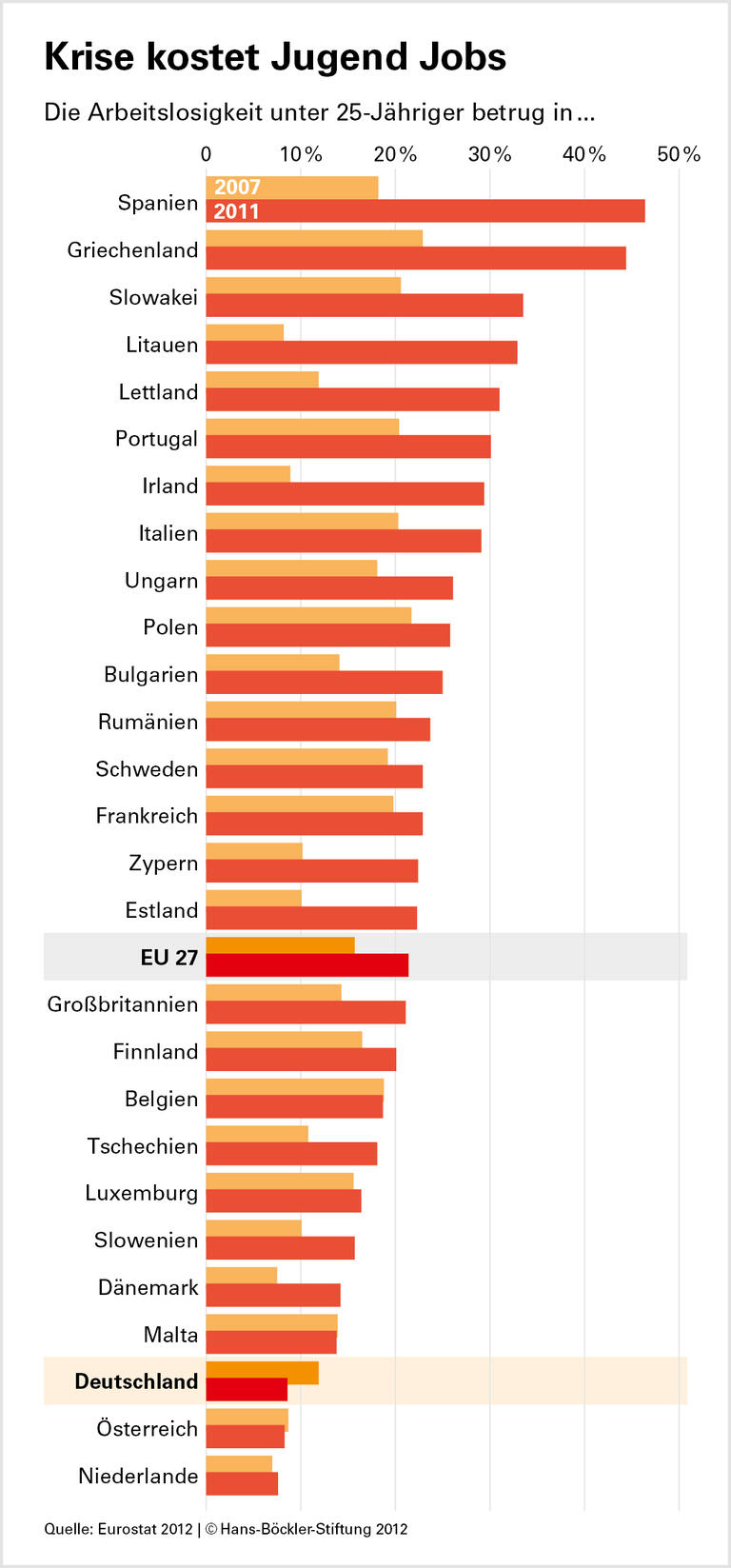 Im EU-Vergleich schnitten die Länder am besten ab, die ein ausgebautes Berufsausbildungssystem haben. So nennt Eurofound zwei Ausnahmen vom allgemeinen Negativ-Trend: Deutschland und Österreich.