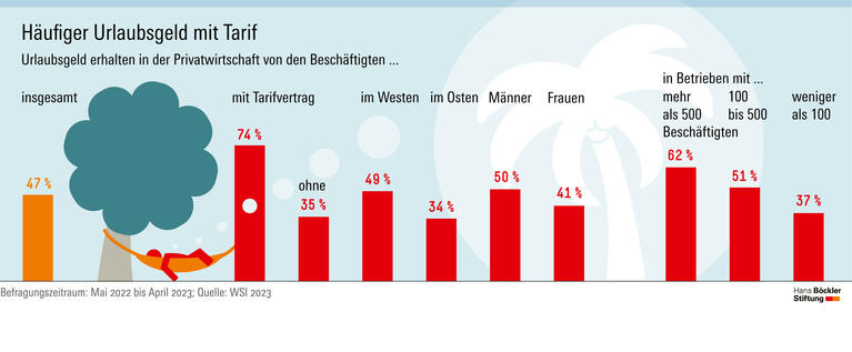 Gerade in Zeiten hoher Inflation sind Sonderzahlungen wie das Urlaubsgeld ein wichtiger Beitrag zur Haushaltskasse. Fast die Hälfte aller Beschäftigten in der Privatwirtschaft erhält Urlaubsgeld, wie eine Online-Befragung des vom WSI betriebenen Internetportals Lohnspiegel.de zeigt. Für die Analyse wurden die Angaben von knapp 60 000 Beschäftigten aus dem Zeitraum von Anfang Mai 2022 bis Ende April 2023 ausgewertet.