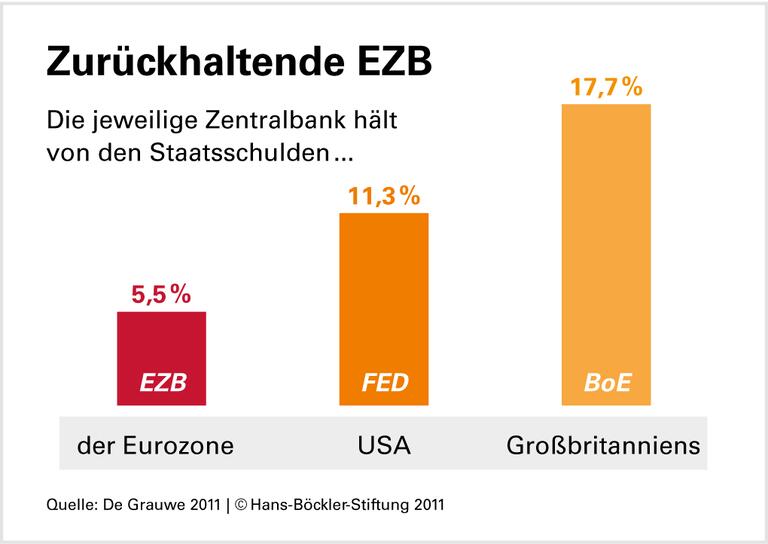Kosten für die Steuerzahler? Wenn die Zentralbank in einer Staatsschuldenkrise nicht interveniert, wird es am Ende nötig sein, viele Banken zu stützen, die durch den Wertverlust von Staatsanleihen in ihrem Portfolio vor der Pleite stehen. Darüber sind sich alle Experten einig. Die Bankenrettung könne letztlich aber deutlich teurer werden, schreibt de Grauwe. Schließlich sei die Gesamtverschuldung des Bankensektors um ein Vielfaches höher als die der Staaten. Zudem weist der Wissenschaftler darauf hin, dass für die Zentralbank ohnehin immer ein Risiko bestehe, Verluste zu machen, die letztlich der Steuerzahler tragen muss. Denn bei ihren so genannten Offenmarktgeschäften kauft sie Wertpapiere privater Anbieter, bei denen gleichermaßen ein Ausfallrisiko besteht. Es würde sich daher nichts Grundsätzliches verändern, wenn die EZB ihre Bestände an Staatsanleihen aufstocken würde, wie es etwa die amerikanische Fed oder die Bank of England getan haben.