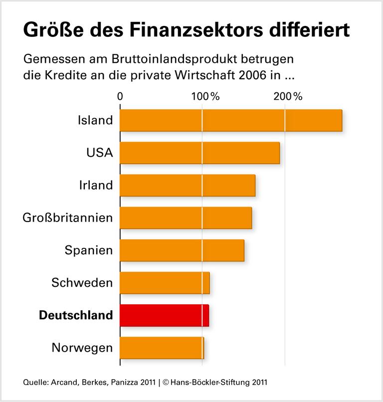 Überschreitet die Summe der Kredite an die Privatwirtschaft das Bruttoinlandsprodukt, bringt eine weitere Ausdehnung des Finanzsektors kein zusätzliches Wachstum mehr – sie destabilisiert die Wirtschaft eher. Zur Grafik