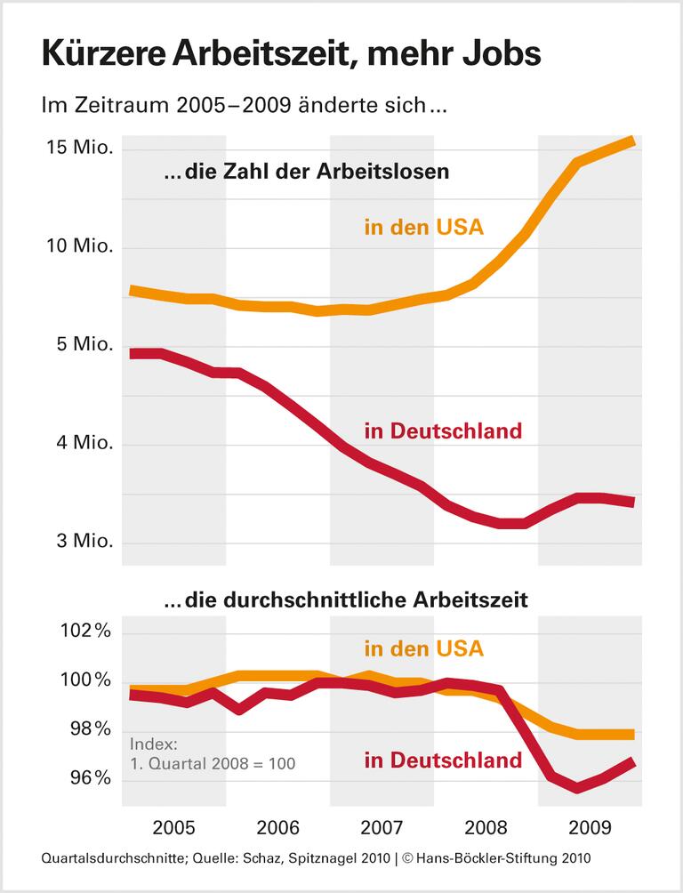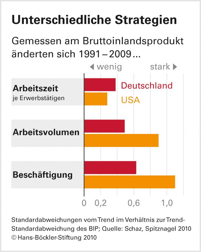Deutschland hat die flexibleren Arbeitszeiten. Die meisten makroökonomischen Arbeitsmarktgrößen sind in den USA volatiler als in Deutschland. Die Zahl der Erwerbstätigen und das gesamtwirtschaftliche Arbeitsvolumen in Stunden schwanken beispielsweise in den Vereinigten Staaten stärker im Verhältnis zu Veränderungen des Bruttoinlandsprodukts als in der Bundesrepublik. Eine Ausnahme stellt die Arbeitszeit dar, hier weist Deutschland die größere Schwankungsbreite auf. Den IAB-Forschern zufolge sind die Arbeitszeiten in Deutschland flexibler, und das im Zuge der Krise sinkende Arbeitsvolumen lässt sich "in Deutschland fast vollständig durch Verkürzung der Arbeitszeit" erklären, schreiben Schaz und Spitznagel. Weil die Arbeitszeiten hier schneller an eine neue konjunkturelle Situation angepasst werden, kommt es zu weniger Entlassungen. Wie stark Arbeitnehmer in Deutschland ihr zeitliches Engagement im Betrieb zurückgefahren haben, zeigen die Arbeitszeitanalysen des IAB: 2009 verringerte sich die Jahresarbeitszeit in Deutschland im Schnitt um 41,3 Stunden oder 3,1 Prozent. Dazu trug die Kurzarbeit von jahresdurchschnittlich 1,14 Millionen Beschäftigten erheblich bei. Im Schnitt ließen die Kurzarbeiter ein Drittel ihrer normalen Arbeitszeit ausfallen. Einen ähnlich großen Anteil am Rückgang des Arbeitsvolumens haben abgeschmolzene Guthaben auf Arbeitszeitkonten und Überstundenabbau. Hinzu kommen weitere krisenbedingte Arbeitszeitverkürzungen und die Zunahme von Teilzeitbeschäftigung.