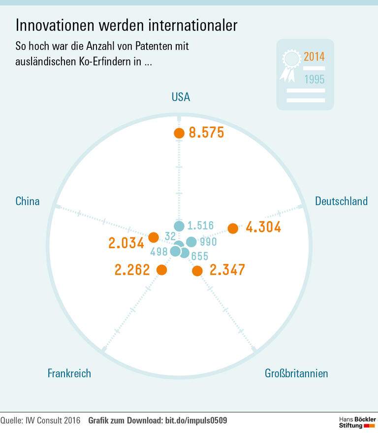 Neben den Verflechtungen beim Leistungsaustausch haben die IW-Experten Kooperationen bei Patenten untersucht, um so internationale Wissensnetzwerke zu identifizieren. Der Auswertung zufolge ist die Zahl solcher Netzwerke zwischen 1995 und 2014 erheblich gewachsen. Mitte der 1990er-Jahre waren 105 Länder an grenzüberschreitenden Patenten beteiligt, 2014 waren es 147. Deutschland kooperiert mittlerweile mit 73 anderen Nationen und erreicht damit Platz zwei hinter den USA. Der Anteil der Patente mit ausländischen Ko-Erfindern ist seit 1995 weltweit von 4,8 auf 7,1 Prozent gestiegen, hierzulande von 7,5 auf 14 Prozent. Dennoch ist im gleichen Zeitraum Deutschlands Anteil an sämtlichen grenzüberschreitenden Patenten von 30 auf 24 Prozent zurückgegangen. Bei der absoluten Zahl sei Deutschland nach den USA und Japan zwar weiter führend, allerdings drohe China aufzuholen, so die Forscher.
