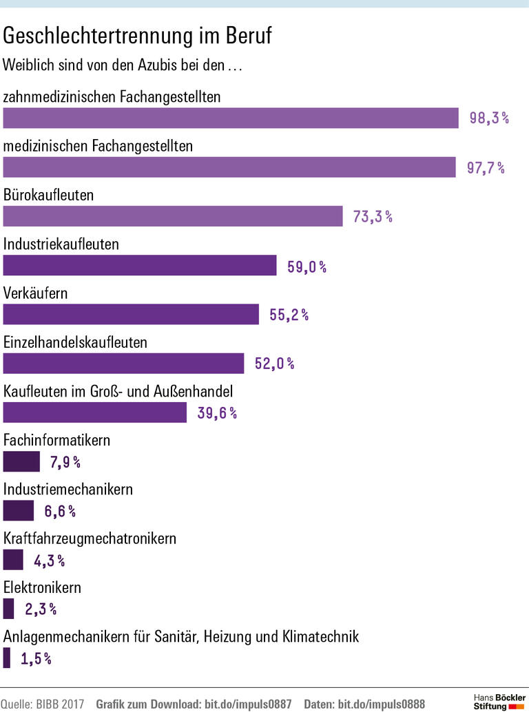 In der Arbeitswelt gibt es nach wie vor viele Männerdomänen: Die wenigsten Kanalbauer, Mechatroniker oder Fachinformatiker sind weiblich. Laut einer empirischen Studie dürfte das auch daran liegen, dass Frauen schon beim Berufseinstieg benachteiligt werden. Die Ökonomen Dorothea Kübler und Robert Stüber vom Wissenschaftszentrum Berlin für Sozialforschung (WZB) sowie Julia Schmid vom Deutschen Institut für Wirtschaftsforschung (DIW) können nachweisen, dass Bewerberinnen bei gleicher Qualifikation systematisch zu kurz kommen, wenn Betriebe Azubis einstellen. Besonders nachteilig wirkt sich das weibliche Geschlecht in Berufen mit einem hohen Männeranteil aus. Männer, die sich für eine Ausbildung in einem Frauenberuf bewerben, haben dagegen gute Karten.