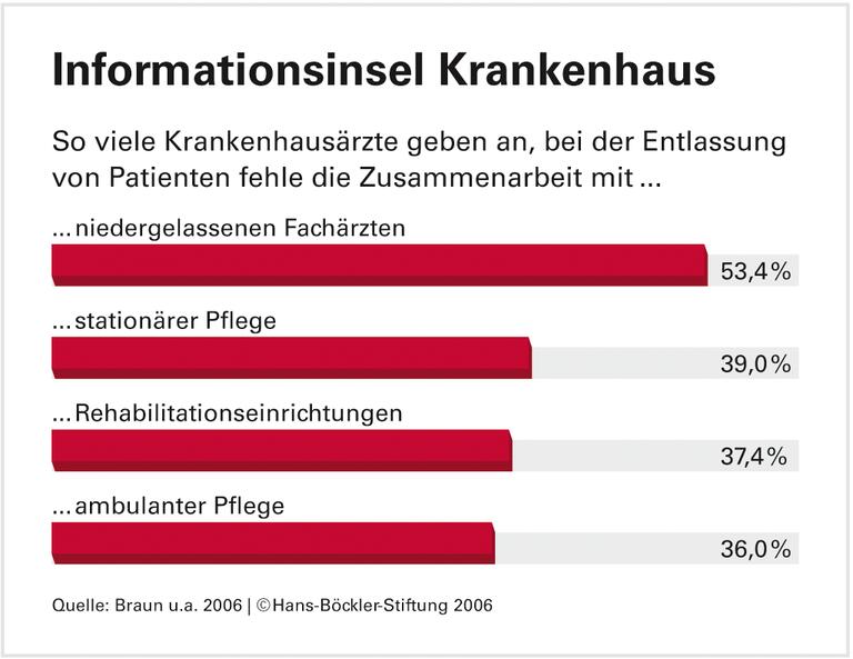 Eine frühzeitige Entlassung sei nur dann gerechtfertigt, so die Wissenschaftler, wenn die Patienten anschließend weiter medizinisch betreut werden - schließlich sind sie noch nicht gesund und benötigen weitere Behandlung. Doch gerade bei der Übergabe an die ambulanten Praxen hapert es. Nur 31 Prozent der befragten Krankenhausärzte haben 2004 systematisch mit niedergelassenen Fachärzten zusammengearbeitet. Von diesen meinten wiederum 40 Prozent, die Kooperation laufe "nicht wie gewünscht". Das hat sich seitdem nicht verbessert. Schon bei der Einweisung der Patienten arbeiten die Ärzte in den Praxen und auf Station nicht gut zusammen: 56 Prozent der Mediziner in der Krankenhäuser sagten, ihnen läge,n beim ersten Patientenkontakt selten oder nie eine komplette Akte vor. 15 bis 20 Prozent der Kranken erklärten, die Aufnahme in die Klinik sei durch Informationsmängel der Ärzte getrübt.
