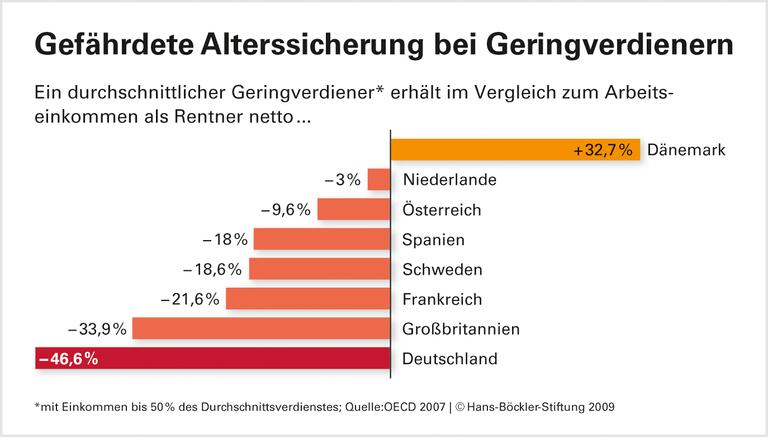 Ausgleich für Geringverdiener. In Deutschland gibt es einen engen Zusammenhang zwischen den Ein- und Auszahlungen in die Rentenkasse. Das so genannte Äquivalenzprinzip sorgt zwar für eine hohe Legitimation der Pflichtversicherung, kann aber auch zum Problem werden, wenn die Rente für viele nicht höher als die Sozialhilfe ist. Leiber verweist auf Länder, die Ausgleichsmechanismen speziell für Geringverdiener haben. Grund- oder Mindestrenten seien in Europa gängig. Leiber empfielt ein Mindestsicherung auch für die deutsche Rentenversicherung. Diese käme "jenen zu Gute, die zu den langjährig versicherten, niedrig entlohnten Beschäftigten gehören". Bei den Anspruchs-Voraussetzungen für diese Mindestsicherung sollten Phasen der Arbeitslosigkeit, der Teilzeit oder Familienarbeit mit berücksichtigt werden, auch um Frauen nicht zu benachteiligen.