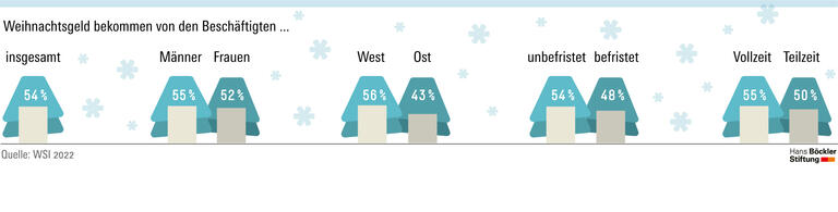 79 Prozent aller Tarifbeschäftigten bekommen Weihnachtsgeld, Beschäftigte in Betrieben ohne Tarifvertrag nur zu 42 Prozent. Insgesamt erhalten 54 Prozent aller Beschäftigten in Deutschland Weihnachtsgeld. Dies geht aus einer Auswertung des WSI-Internetportals Lohnspiegel.de hervor. Die Daten beruhen auf einer Online-Befragung, an der sich zwischen Anfang November 2021 und Ende Oktober 2022 mehr als 63 000 Beschäftigte beteiligt haben.