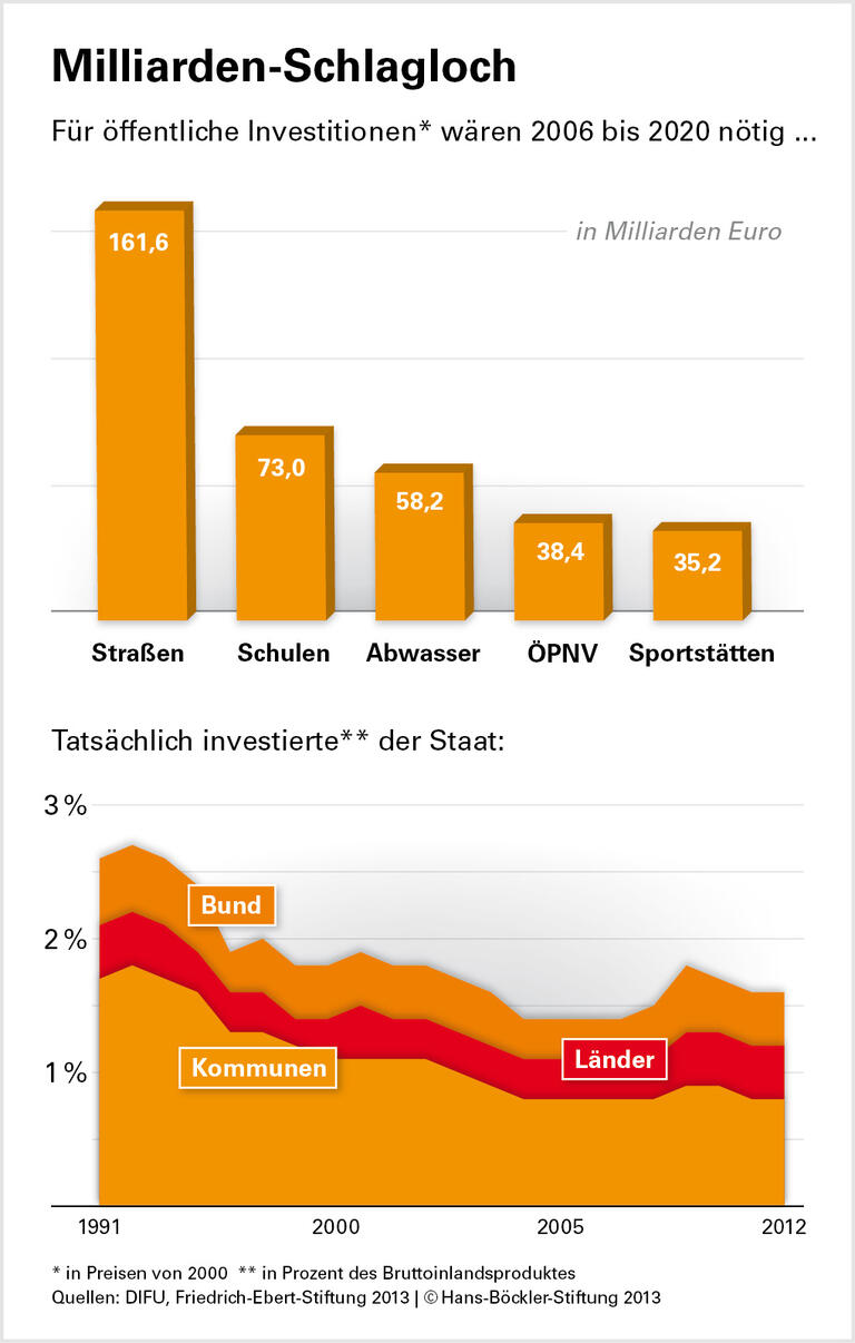 Deutschland muss dringend in seine Infrastruktur investieren. Allein auf kommunaler Ebene sind unter anderem für die Ausbesserung kaputter Straßen und die Reparatur maroder Schulen gut 50 Milliarden Euro nötig.