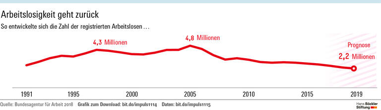 Die Zahl der registrierten Arbeitslosen wird 2018 um 180 000 Personen schrumpfen. 2019 dürfte sie um weitere 120 000 zurückgehen. Das geht aus der jüngsten Konjunkturprognose des IMK hervor. Die Arbeitslosenquote wird demnach im Durchschnitt des laufenden Jahres 5,3 Prozent betragen und 2019 nur noch bei 5 Prozent liegen.