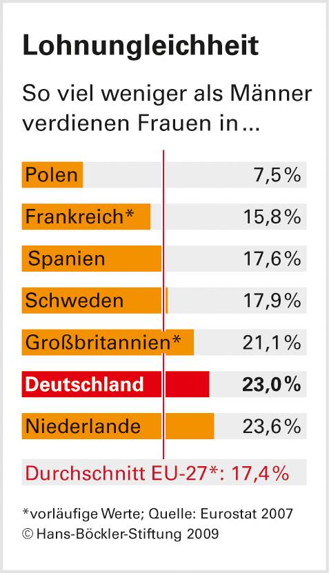 "In Deutschland gibt es keine Strategie zur Förderung der geschlechtsspezifischen Entgeltgleichheit", sagt Ziegler. Die Politik setze auf Freiwilligkeit, Gesetze fehlten. Andere Länder sind da weiter. Christina Klenner, Gleichstellungsexpertin am WSI, verweist auf das Beispiel Quebec: Nach dem Lohngleichheitsgesetz der kanadischen Provinz sind Unternehmen ab zehn Mitarbeitern verpflichtet, geschlechtsspezifische Lohndiskriminierung zu ermitteln und zu beseitigen. Unternehmen mit mehr als 100 Beschäftigten müssen hierfür ein Lohngleichheitskomitee einsetzen, dass zu zwei Dritteln aus Arbeitnehmervertretern und mindestens zur Hälfte aus Frauen besteht. "Dieses Modell könnte für Deutschland ein Vorbild sein. Das gilt auch für die in Quebec eingesetzten Softwarelösungen. Sie helfen Arbeitgebern, Arbeit gerechter zu bewerten", so Klenner.