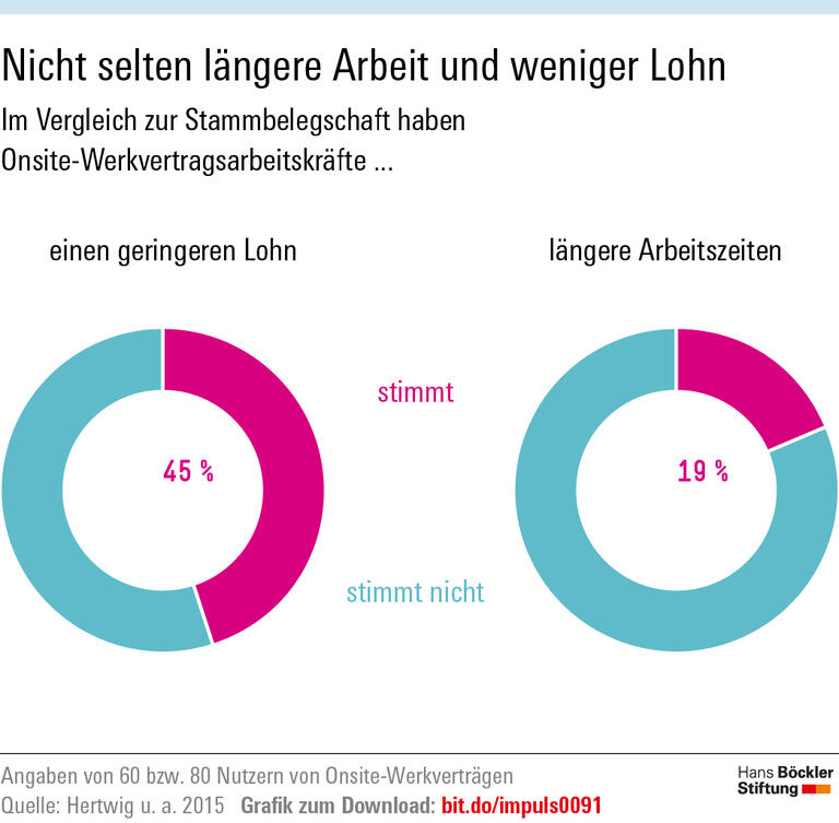 Doch auch wenn die Verträge rechtlich unangreifbar gestaltet sind, haben sie in der Regel gravierende Nebenwirkungen: Die Löhne in Werkunternehmen seien „im Durchschnitt niedriger und die Flexibilitätslasten höher als bei den Stammbeschäftigten“, schreiben Hertwig, Kirsch und Wirth. Zudem würden Werkvertragsarbeiter häufig in besonders belastenden Bereichen eingesetzt und müssten längere Arbeitszeiten in Kauf nehmen. Für die meisten gelte entweder überhaupt kein Tarifvertrag oder die tariflichen Bestimmungen seien deutlich ungünstiger als diejenigen des Auftraggebers. Aber auch Stammbeschäftigte der Werkbesteller gerieten durch „die Zunahme kostenmotivierter Personalstrategien oder die Androhung von Outsourcing unter Druck“.