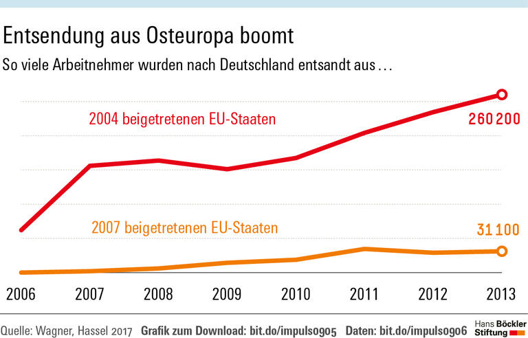Die Zahl der entsandten Arbeitnehmer hat sich zwischen 2006 und 2013 bis auf 373 000 versechsfacht. Das mit Abstand wichtigste Herkunftsland ist Polen, danach folgen die Slowakei, Ungarn und Rumänien. Laut einer Studie der EU-Kommission ist Deutschland das Hauptziel für Entsendungen, während regulär Beschäftigte aus Osteuropa hierzulande vergleichsweise selten sind. Dabei hätten Studien gezeigt, dass viele Unternehmen Entsendungen nutzen, um Tarifstandards zu unterminieren und gesetzliche Vorgaben zu umgehen, so die Autorinnen.