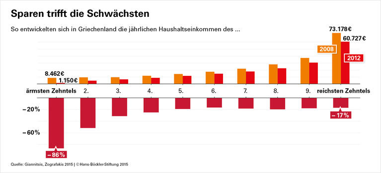 Armutsschwelle sinkt, Armutsquote steigt. Aggregierte Indikatoren zur Messung der Einkommensverteilung könnten die teilweise existenzbedrohenden finanziellen Einbußen, die insbesondere ärmere Haushalte erlitten haben, nur unzureichend abbilden, betonen die Wissenschaftler. Da gleichzeitig auch bei den reicheren Haushalten erhebliche Einkommensverluste entstanden, veränderte sich etwa der Gini-Koeffizient für Griechenland, der schon vor der Krise eine im europäischen Vergleich sehr ungleiche Verteilung anzeigte, kaum: Nach einigen Quellen stieg er geringfügig, nach anderen sank er ein wenig.