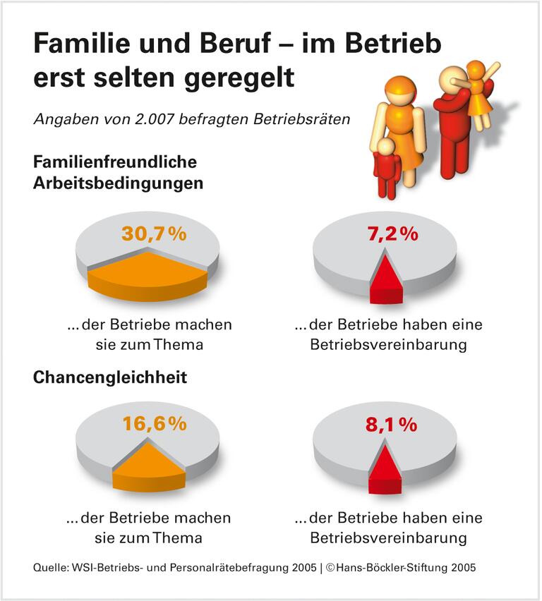 Familie ist in aller Munde, ihre Bedeutung für Wirtschaft und Gesellschaft unbestritten. Überall entstehen "Bündnisse für Familie", Familienfreundlichkeit gilt mittlerweile als Standortfaktor. Mit konkreten Vereinbarungen unterstützen jedoch erst wenige Unternehmen die Vereinbarkeit von Beruf und Privatleben. Nur jeder dreizehnte Betrieb hat Familienfreundlichkeit festgeschrieben, weniger als ein Drittel der Betriebsräte hat sich überhaupt jemals mit diesem Thema beschäftigt*, so die jüngste WSI-Betriebsrätebefragung in Unternehmen mit mehr als 20 Beschäftigten.
