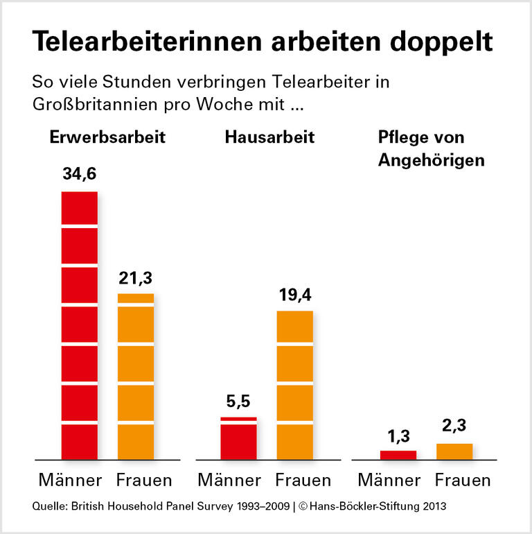 Für diese Vermutung sprechen auch die Unterschiede bei den Arbeitszeiten: Während männliche Telearbeiter im Schnitt 34,6 Stunden pro Woche erwerbstätig sind, kommen Telearbeiterinnen nur auf 21,3 Stunden. Umgekehrt sieht es bei der Hausarbeit aus: Männer, die zu Hause arbeiten, engagieren sich wöchentlich 5,5 Stunden im Haushalt, Frauen dagegen 19,4 Stunden. Hinzu kommen 1,3 Stunden für die Pflege von alten oder kranken Angehörigen bei den männlichen und 2,3 Stunden bei den weiblichen Telearbeitern. Viele Frauen, resümiert der Ökonom, nutzten das Home Office offenbar, um parallel zur Erwerbsarbeit ihren häuslichen Verpflichtungen nachgehen zu können. Insgesamt unterscheide sich ihre Arbeitsbelastung trotz der kürzeren Arbeitszeiten nicht wesentlich von derjenigen der Männer oder anderer berufstätiger Frauen.