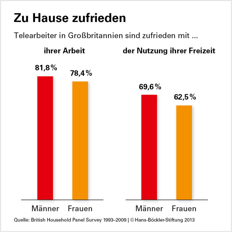 Bei der Arbeitszufriedenheit schneiden sowohl männliche als auch weibliche Telearbeiter besser ab als Beschäftigte, die auf dem Gelände ihres Arbeitgebers oder unterwegs arbeiten – auch dann, wenn Faktoren wie das Alter, die Wochenarbeitszeit oder die berufliche Position herausgerechnet werden. Auch mit ihrer Freizeit sind Heimarbeiter unabhängig vom Geschlecht zufriedener. Bei Frauen sind die Unterschiede in der Zufriedenheit allerdings stärker ausgeprägt im Hinblick auf die Erwerbsarbeit als hinsichtlich der Freizeit. Ein möglicher Grund: die überdurchschnittlich hohe Belastung durch Hausarbeit bei Telearbeiterinnen.