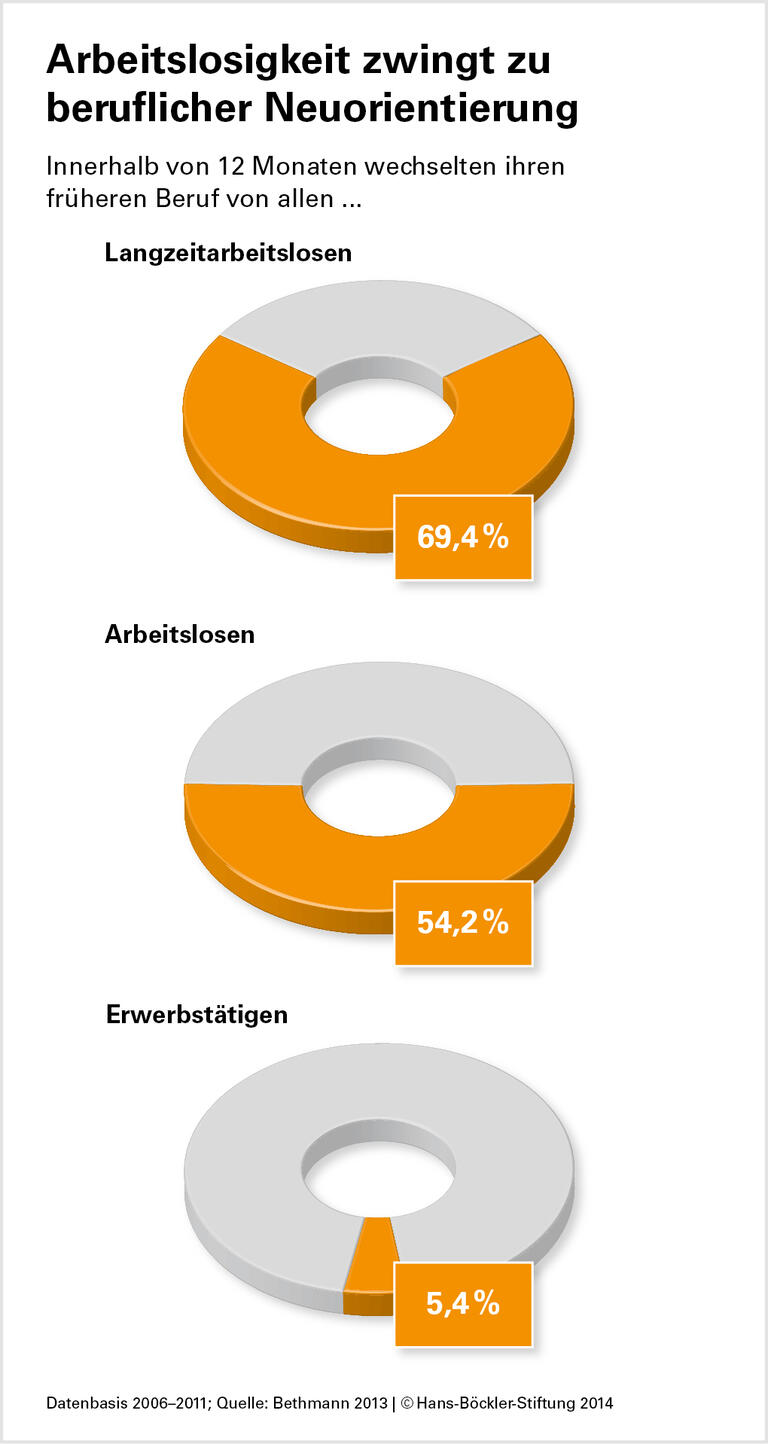 Um seine Argumente empirisch zu überprüfen, hat der Forscher Daten der Panelstudie „Arbeitsmarkt und Soziale Sicherung“ ausgewertet, für die das IAB seit 2006 jährlich 12.000 bis 19.000 Personen interviewt. Von den befragten Erwerbstätigen wechseln im Schnitt 5,4 Prozent innerhalb eines Jahres den Beruf. Bei den Kurzzeitarbeitslosen, die den Wiedereinstieg in den Arbeitsmarkt geschafft haben, sind es dagegen 54,2 Prozent, bei den zuvor Langzeitarbeitslosen 69,4 Prozent.