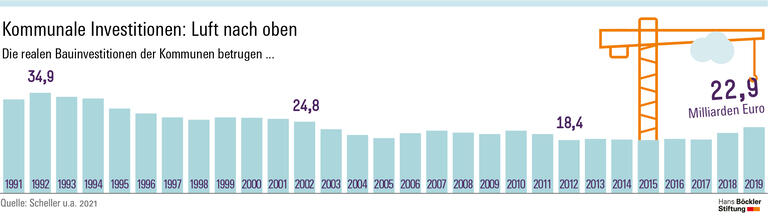 Fehlende Kapazitäten der privaten Bauwirtschaft wurden von den Kommunen in den vergangenen Jahren verstärkt als Problem genannt und rangieren nach finanziellen und personellen Engpässen auf Platz drei der Investitionshemmnisse, heißt es in der Studie. Tatsächlich hat sich die Zahl der offenen Stellen im Baugewerbe zwischen Ende 2010 und dem dritten Quartal 2020 von 52 000 auf 139 000 mehr als verdoppelt. Zugleich liegt der Anteil der 55- bis 64-Jährigen bei 23,7 Prozent, die Zahl der Absolventen in Bauberufen ist dagegen 2019 mit 7500 gut 73 Prozent geringer ausgefallen als 1998. Verschärft habe den Fachkräftemangel die „prozyklische Bautätigkeit der öffentlichen Hand“, schreiben die Wissenschaftler. Personal, das in Krisen wegen fehlender Aufträge abgebaut wird, könne danach nur mühsam wiedergewonnen werden, sodass die Kapazitäten der Konjunktur hinterherhinken.