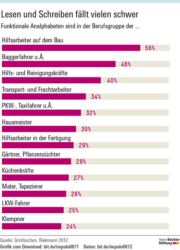 Es betrifft mehr Menschen, als die meisten denken: 14 Prozent der Bevölkerung im Erwerbsalter – 7,5 Millionen Personen – gelten als funktionale Analphabeten. Das heißt, sie können einzelne Wörter oder kurze Sätze lesen und schreiben, sind aber nicht in der Lage, zusammenhängende Texte zu verstehen oder zu verfassen. Wer glaubt, mit diesem Handicap sei keine Teilnahme am Erwerbsleben möglich, irrt: 57 Prozent der funktionalen Analphabeten sind berufstätig – oft als Hilfskräfte in körperlich anstrengenden Jobs. Allerdings wird es auch an solchen Arbeitsplätzen immer schwieriger, ohne Grundbildung auszukommen, so Sandra Saeed, Uwe Kühnert und Anja Gerhardt in einer Studie für die Hans-Böckler-Stiftung.