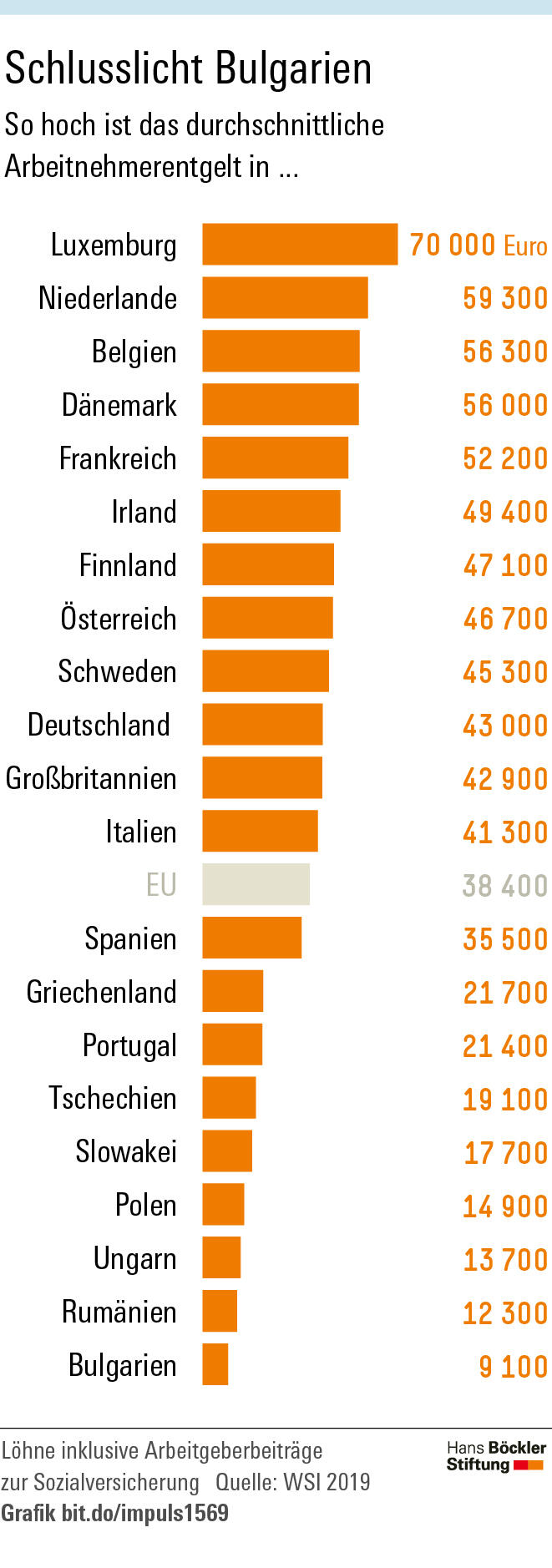 Trotz überproportionaler Lohnsteigerungen in Osteuropa gibt es beim Entgeltniveau immer noch große Unterschiede zwischen den Mitgliedsstaaten, zeigt die Untersuchung. Während Beschäftigte in Bulgarien pro Jahr im Schnitt auf ein Arbeitnehmerentgelt von 9100 Euro kommen, sind es in Luxemburg 70 000 Euro. Deutschland liegt mit 43 000 Euro auf Platz 10, bedingt durch den hohen Anteil an geringfügig Beschäftigten. Den starken Rückstand in vielen osteuropäischen Ländern mit niedrigerer Produktivität rechtfertigen zu wollen, überzeuge längst nicht mehr, betont der Forscher. Vielmehr seien die Löhne in diesen Ländern auch gemessen an der Produktivität sehr niedrig – ein klares Indiz für eine wirtschaftliche und gesellschaftliche Unwucht. Eine Stärkung der Tarifvertragsinstitutionen im Zusammenspiel mit angemessenen Mindestlöhnen könnte nach Lübkers Einschätzung dazu beitragen, das von vielen Bürgern empfundene Gerechtigkeitsdefizit der EU zu bewältigen und den gesellschaftlichen Zusammenhalt zu festigen.