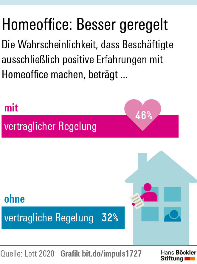 Daneben spielt die Formalisierung eine Rolle: Ist Homeoffice vertraglich geregelt, machen 46 Prozent der Arbeitnehmer durchweg gute Erfahrungen, ohne vertragliche Regelung – etwa bei informellen Absprachen – sind es 32 Prozent. Allerdings arbeiten bisher nur 17 Prozent der Beschäftigten im Homeoffice auf Basis einer vertraglichen Regelung.