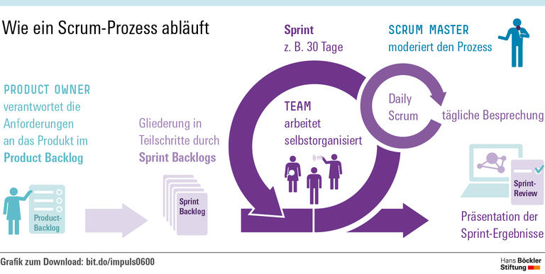 In vielen Unternehmen wird derzeit nach Konzepten gesucht, wie sich Arbeitsabläufe schlank und agil – „lean and agile“ – organisieren lassen. Als Vorbilder dienen Prinzipien agiler Methoden wie zum Beispiel „Scrum“, die bei der Programmierung von Software bereits seit den 1990er-Jahren zum Einsatz kommen. Sie beruhen auf der Erkenntnis, dass sich komplexe Projekte kaum durch einen von oben herab verordneten Plan umsetzen lassen, sondern in vielen Schritten erarbeitet werden müssen. Anfangs wird dabei nur das Ziel festgelegt, der Weg dahin ergibt sich im Verlauf. Die Arbeit wird in Einzelteile zerlegt und von kleinen, selbstorganisierten Einheiten erledigt. An die Stelle langer Projektzyklen treten kurze Intervalle. Am Ende jeder Entwicklungsphase – zum Beispiel nach zwei oder vier Wochen – präsentiert jedes Team ein fertiges Ergebnis, das dann in der nächsten Phase erweitert werden kann.