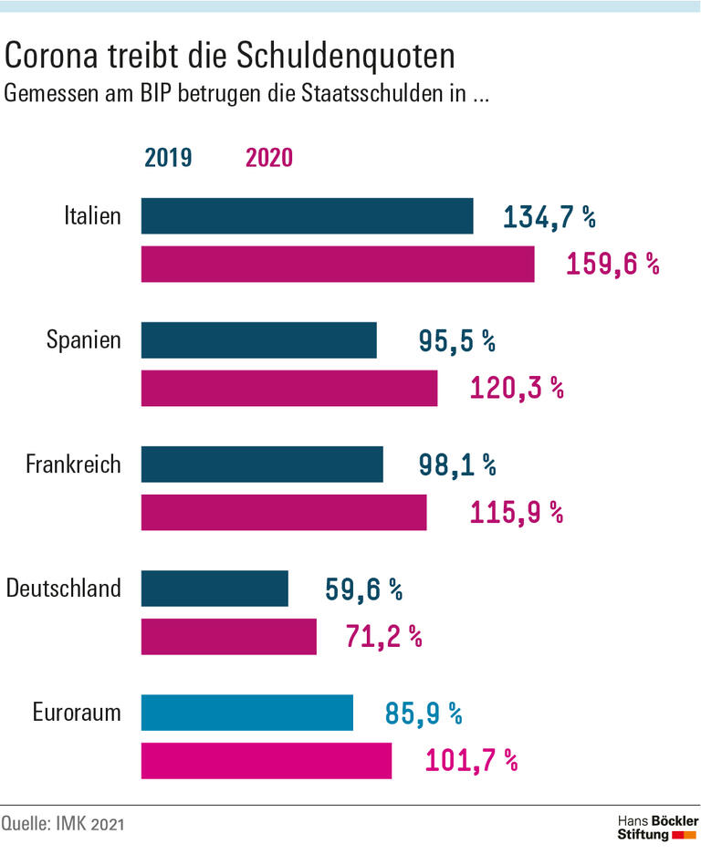 Bundesregierung und EU haben dafür im abgelaufenen Jahr wichtige Weichen gestellt, der eingeschlagene Weg sollte unbedingt fortgesetzt werden, mahnen die IMK-Forscher. Die zur Bekämpfung der Coronakrise nötige höhere Staatsverschuldung sei kein Hindernis für mehr Zukunftsinvestitionen, diese sollten vielmehr absolute Priorität gegenüber einer forcierten Rückzahlung der Kredite haben. Der von der Schuldenbremse vorgesehene Tilgungszeitplan ist der Analyse zufolge zu eng und sollte zumindest stark gestreckt werden. Wenn das geschieht, stünden die Chancen gut, dass die deutsche Wirtschaft in den kommenden Jahren aus der höheren Verschuldung herauswächst – so wie nach der Finanz- und Wirtschaftskrise 2008/2009.
