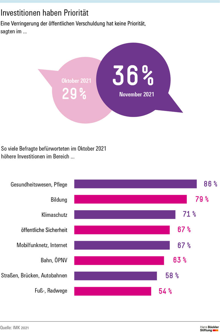 Eine Kreditfinanzierung von öffentlichen Ausgaben erscheint deutlich mehr Menschen in Deutschland akzeptabel als noch unmittelbar nach der Bundestagswahl. Das zeigt eine Umfrage im Auftrag des IMK. Parallel zu den Verhandlungen über eine Ampelkoalition haben sich bei der Frage, ob eine Verringerung des öffentlichen Defizits und der Verschuldung derzeit Priorität habe oder nicht, in kurzer Zeit die relativen Mehrheiten verschoben. So waren bei der ersten Befragungswelle von Ende September bis Anfang Oktober 2021 29 Prozent der Befragten der Ansicht, Defizit- und Schuldenabbau sei derzeit keine prioritäre Aufgabe. Dieser Anteil ist bis Mitte November auf 36 Prozent gestiegen. Entsprechend ging der Anteil derer zurück, die dem Thema hohe Priorität zuschreiben, von 39 auf 35 Prozent. Die Quote der Unentschiedenen sank von 28 auf 26 Prozent. Gleichzeitig blieb die schon bei der ersten Befragungswelle hohe Zustimmung zu einer Ausweitung öffentlicher Investitionen etwa in Gesundheit, Bildung oder Klimaschutz unverändert hoch.