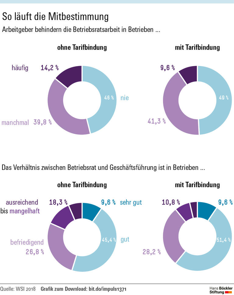 Die Mehrheit der Chefs von mitbestimmten Betrieben scheint sich um eine gedeihliche Kooperation zu bemühen: Immerhin beurteilen knapp zehn Prozent der im Jahr 2017 vom WSI befragten Betriebsräte das Verhältnis als „sehr gut“, weitere knapp 50 Prozent als „gut“. Doch da, wo die Noten „ausreichend“ oder insbesondere „mangelhaft“ vergeben werden, „darf bezweifelt werden, ob damit noch eine vertrauensvolle Zusammenarbeit möglich ist“, wie sie das Betriebsverfassungsgesetz fordert, schreibt WSI-Forscher Helge Baumann. Auffallend ist nach Analyse des Experten, dass die Arbeitsbeziehung zwischen Führungsetage und Beschäftigtenvertretung häufiger schlecht ist, wenn das Unternehmen keinen Tarifvertrag hat. In Firmen ohne Tarifregelung sprechen gut 18 Prozent der Betriebsräte von einem „ausreichenden“ oder gar „mangelhaften“ Verhältnis. In Unternehmen mit Tarifvertrag sind es dagegen knapp elf Prozent.
