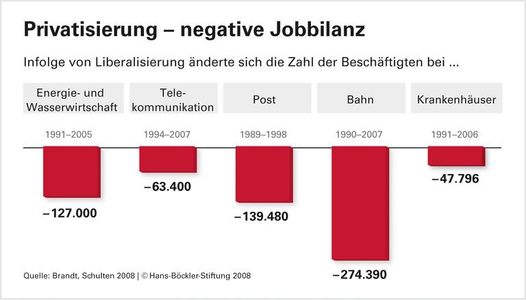Zwischen 1991 und 2006 fielen im öffentlichen Dienst mehr als 2,1 Millionen Beschäftigungsverhältnisse weg. Das war fast ein Drittel aller Stellen im Staatsdienst. Im Gegenzug entstanden zwar auch neue Jobs in privaten Firmen, zum Beispiel bei den Konkurrenten der ehemals staatlichen Telekom oder bei privaten Briefdienstleistern. Der Gesamteffekt sei jedoch negativ, so die Wissenschaftler. Ähnliches sei auch in anderen europäischen Ländern festzustellen. Die von der EU geäußerte Erwartung, die Liberalisierung der Wirtschaftszweige Telekommunikation, Post, Transport und Energie werde in Europa eine Million zusätzliche Stellen schaffen, habe sich nicht erfüllt. Brandt und Schulten haben die Beschäftigungsentwicklung in Deutschland für wichtige Teile der staatlichen oder vormals staatlichen Wirtschaft nachgezeichnet.