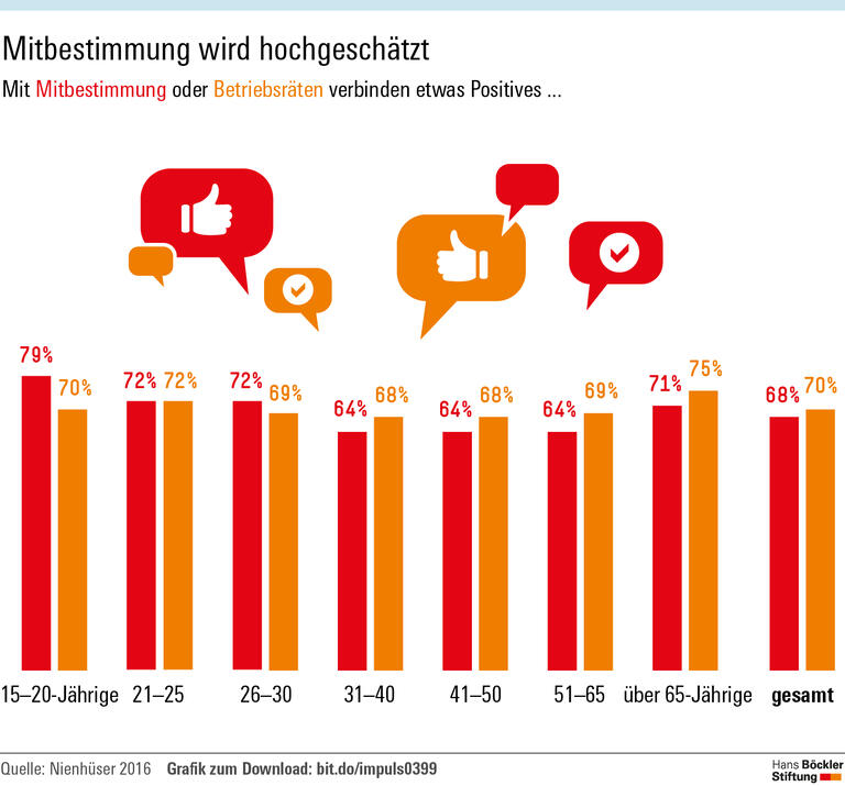 In einer Frage herrscht über alle Altersgruppen hinweg Einigkeit: Die große Mehrheit hält Mitbestimmung für eine gute Sache. Die Befragten konnten spontan Wörter oder kurze Sätze äußern, die ihnen zu den Begriffen „Mitbestimmung der Arbeitnehmer“ und „Betriebsrat“ einfielen und dann angeben, ob sie diese positiv, neutral oder negativ meinen. Bezogen auf Mitbestimmung liegt der Anteil positiver Assoziationen bei 68 Prozent, auf den Betriebsrat bei 70 Prozent. Unter den Jüngsten beträgt der Anteil sogar 79 Prozent und 70 Prozent. Hoch liegt mit 67 Prozent auch der Anteil derjenigen, die zustimmen, dass Arbeitnehmer mindestens gleich viel Einfluss haben sollten wie Arbeitgeber. Die große Zustimmung könne damit zusammenhängen, dass Mitbestimmung fest etabliert ist und als selbstverständlich erachtet wird. Nicht nur von „normalen“ Beschäftigten, sondern auch von Selbstständigen oder Führungskräften wird sie laut Nienhüser mehrheitlich kaum in Frage gestellt.