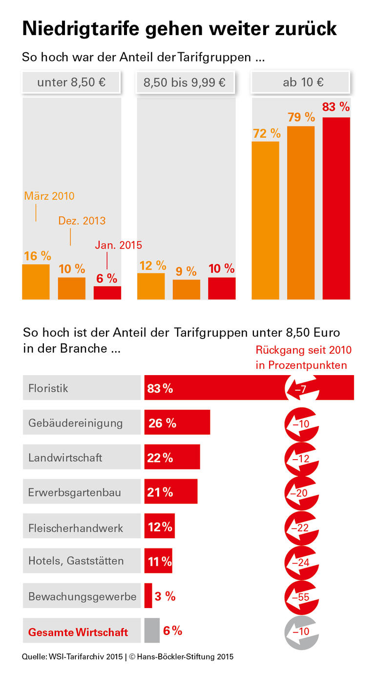 In 284 oder 6 Prozent aller Gruppen sind weniger als 8,50 Euro pro Stunde vorgesehen. In den vergangenen Jahren ist der Anteil aber deutlich zurückgegangen: Ende 2013 lag die Quote noch bei 10, Anfang 2010 bei 16 Prozent. Die positive Entwicklung zeige, „dass die Gewerkschaften die Situation im Niedriglohnsektor aus eigener Kraft deutlich verbessert haben“, sagt WSI-Forscher Bispinck. „Dabei hat sicherlich geholfen, dass der von den Gewerkschaften seit langem geforderte gesetzliche Mindestlohn den Druck auf die Arbeitgeberverbände erhöht hat.“