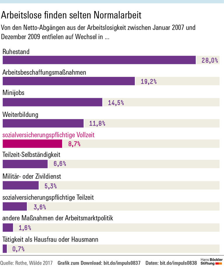 Wenn man beide Datensätze zusammenführt und die Netto-Abgänge aus der Arbeitslosigkeit zwischen Januar 2007 und Dezember 2009 berechnet, zeigt sich, dass Wechsel in Normalarbeit nur eine untergeordnete Rolle gespielt haben. Lediglich 9 Prozent der Ex-Arbeitslosen haben eine sozialversicherungspflichtige Vollzeitbeschäftigung aufgenommen, 4 Prozent sozialversicherungspflichtige Teilzeit. Viel wichtiger waren Minijobs mit 15 Prozent, Arbeitsbeschaffungsmaßnahmen mit 19 Prozent und Weiterbildung mit 12 Prozent. In den Ruhestand haben sich 28 Prozent verabschiedet.