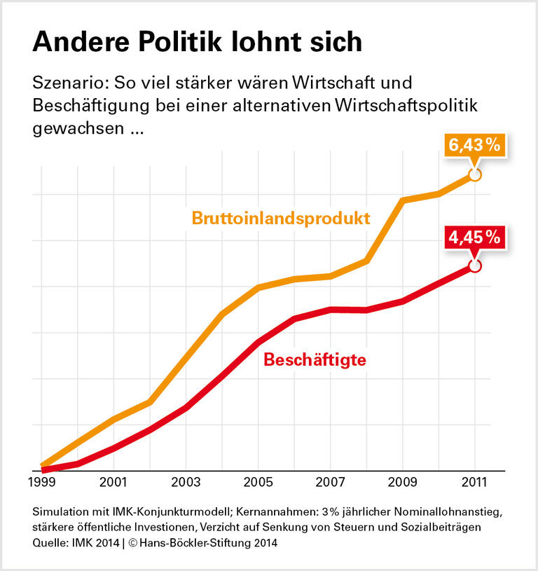 Positive Impulse auf dem Arbeitsmarkt … Um die Erholung wirklich voranzubringen, empfiehlt das IMK daher, in den europäischen Überschussländern die Nachfrage zu stärken. Das eröffne auch den Krisenländern bessere Chancen im innereuropäischen Handel. Eine höhere Binnennachfrage lässt sich laut IMK sowohl über eine stärkere Lohnentwicklung als auch über höhere öffentliche Investitionen erreichen. „Deutschland ist dabei besonders gefragt, auch im ureigenen Interesse“, sagt Horn. So zeigen Simulationsrechnungen mit dem Konjunkturmodell des IMK, dass das deutsche Bruttoinlandsprodukt zwischen 1999 und 2011 um rund sechs Prozentpunkte stärker gestiegen wäre, wenn die Löhne sich kräftiger entwickelt hätten und der Staat seine Ausgaben nicht eingeschränkt und insbesondere die Investitionen nicht zurückgefahren, sondern stattdessen auf Steuersenkungen verzichtet hätte.