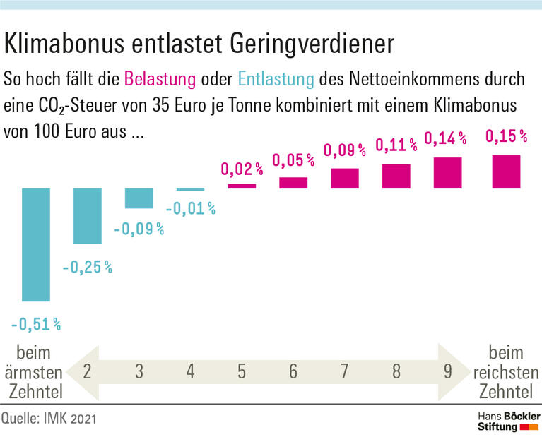 Viele Menschen haben mittelfristig wenig Möglichkeiten, ihren Kohlendioxid-Ausstoß zu senken, etwa weil sie in schlecht gedämmten Mietwohnungen mit Ölheizung wohnen oder mangels Alternativen aufs Auto angewiesen sind. Bei diesen Haushalten führt ein höherer CO₂-Preis zu größeren Belastungen. Das Klimapaket von 2019 sehe dafür kaum einen Ausgleich vor, erklären die IMK-Forscher. Die Kompensationen seien wenig sichtbar wie die Senkung der EEG-Umlage, förderten Vielfahrer, etwa durch die Pendlerpauschale, liefen wie die Mobilitätsprämie ins Leere oder glichen lediglich Versäumnisse der Vergangenheit aus, was zum Beispiel für die Erhöhung des Wohngeldes gilt. Auch die Förderung der E-Mobilität und der energetischen Gebäudesanierung sowie die Mehrwertsteuersenkung im Fernverkehr der Bahn wirkten sich eher zugunsten von Besserverdienern aus.