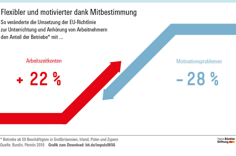 Wenn man zusätzlich Faktoren wie die wirtschaftliche Situation, den Frauenanteil in der Belegschaft und die Qualifikationsstruktur berücksichtigt, zeigt sich, dass durch die Gesetzesänderungen in den vier untersuchten Ländern tatsächlich der Anteil der größeren Firmen mit institutionalisierten Formen der betrieblichen Interessenvertretung durch Gewerkschaften oder Betriebsräte um ein Drittel gestiegen ist. Die Auswirkungen auf die Arbeitszeitflexibilität sind signifikant positiv: Der Anteil der von der Richtlinie betroffenen Betriebe, die Arbeitszeitkonten anbieten, erhöht sich um mehr als ein Fünftel. Das hat messbare Vorteile auch aus Arbeitgebersicht: Der Anteil der Manager, die über Motivationsprobleme klagen, geht um 28 Prozent zurück.