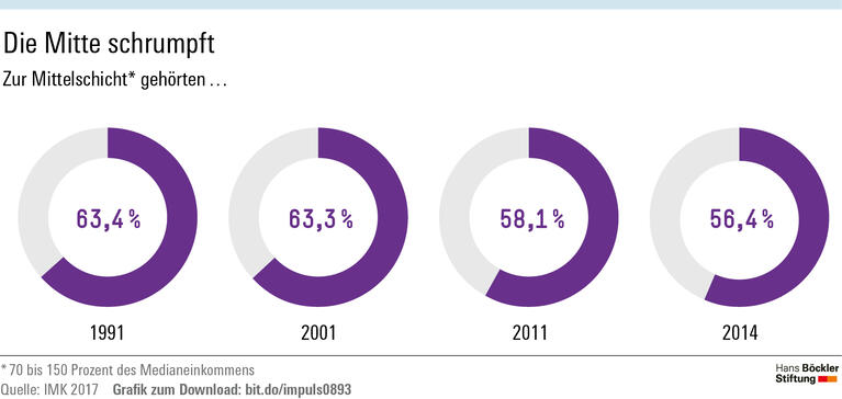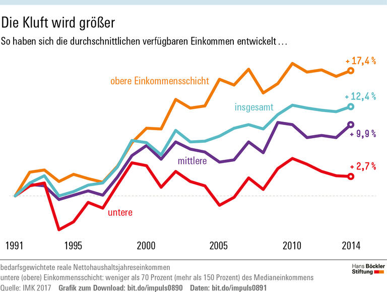 Dass Ungleichheit ein gravierendes Problem darstellt, zeigen die IMK-Forscher anhand der neuesten Daten des Sozio-oekonomischen Panels (SOEP). Dabei haben sie die Bevölkerung in drei Einkommensgruppen eingeteilt: Wer weniger als 70 Prozent des mittleren Einkommens zur Verfügung hat, gehört finanziell zur unteren Schicht, wer mindestens 150 Prozent ausgeben kann, zur oberen, der Rest zur Mitte. Den Berechnungen zufolge ist das durchschnittliche verfügbare Einkommen der oberen Gruppe von 1991 bis 2014 real um gut 17 Prozent gestiegen, das der Mitte um zehn Prozent. Die Geringverdiener mussten sich dagegen über den Zeitraum von mehr als zwei Jahrzehnten mit Zuwächsen von insgesamt knapp drei Prozent begnügen. Die Diskrepanz zwischen den Einkommensklassen hat sich also deutlich vergrößert. Zugleich ist die Mittelschicht geschrumpft: Der Anteil der Haushalte mit 70 bis 150 Prozent des mittleren Einkommens hat zwischen 1991 und 2014 von 63 auf 56 Prozent abgenommen.