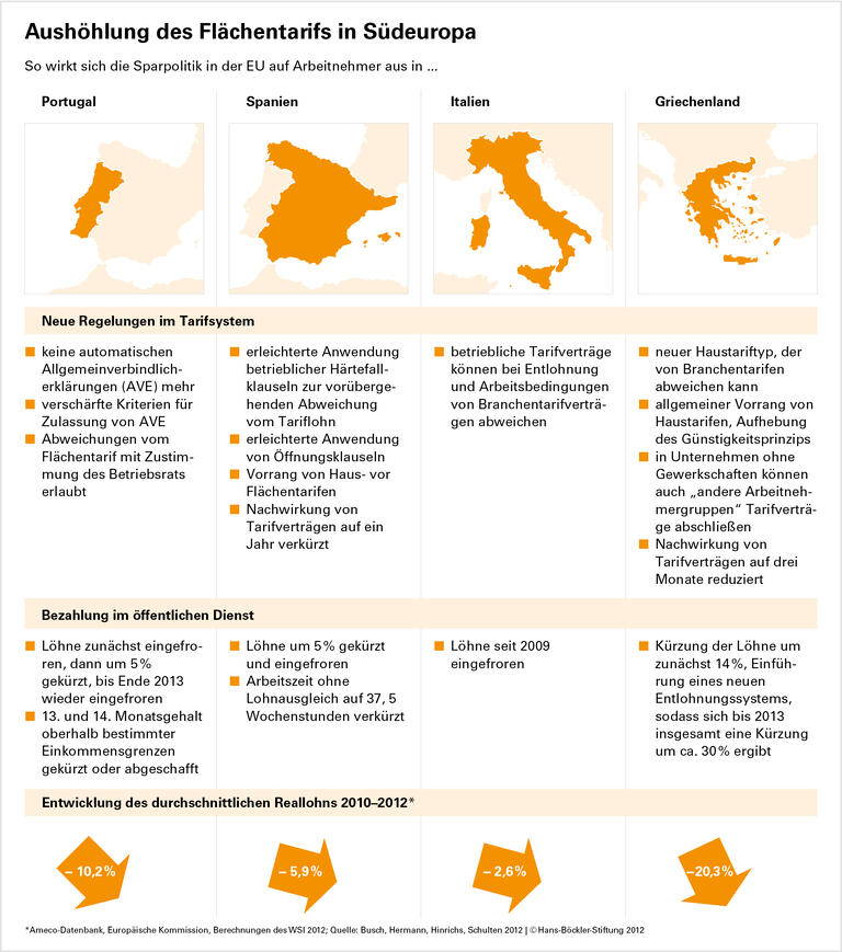 Unter dem Druck von EU, EZB und IWF setzen die südlichen Euro-Länder so genannte Strukturreformen um: Sie höhlen die traditionellen Tarifsysteme aus und setzen bei den Löhnen damit eine Abwärtsspirale in Gang.