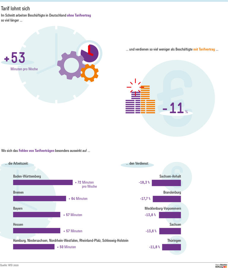 Die Arbeitsbedingungen sind in tarifgebundenen Unternehmen durchweg besser als in Unternehmen ohne Tarif. So arbeiten Vollzeitbeschäftigte in tariflosen Betrieben im bundesweiten Schnitt wöchentlich eine knappe Stunde länger und verdienen gleichzeitig deutlich weniger als die Kollegen in Betrieben mit Tarifbindung. Das geht aus einer Analyse der WSI-Forscher Malte Lübker und Thorsten Schulten hervor. Sie basiert auf dem Betriebspanel des Instituts für Arbeitsmarkt- und Berufsforschung.