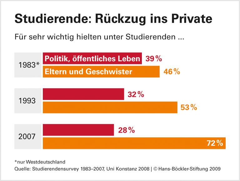 Die Neigung, sich mit Politik zu beschäftigen, ist in allen Fächern geschwunden. Am meisten Interesse haben jene, die bald beruflich mit Gesetzen zu tun haben: Jura-Studenten. Die Studierenden von heute halten das Thema "Politik und Öffentlichkeit" für weniger wichtig als ihre Vorgänger in den 1980er- und 1990er-Jahren. Dagegen wächst sehr stark die Wertschätzung der Familie. Es handele sich um einen grundlegenden Wandel der Einstellungen, schreibt Bargel.