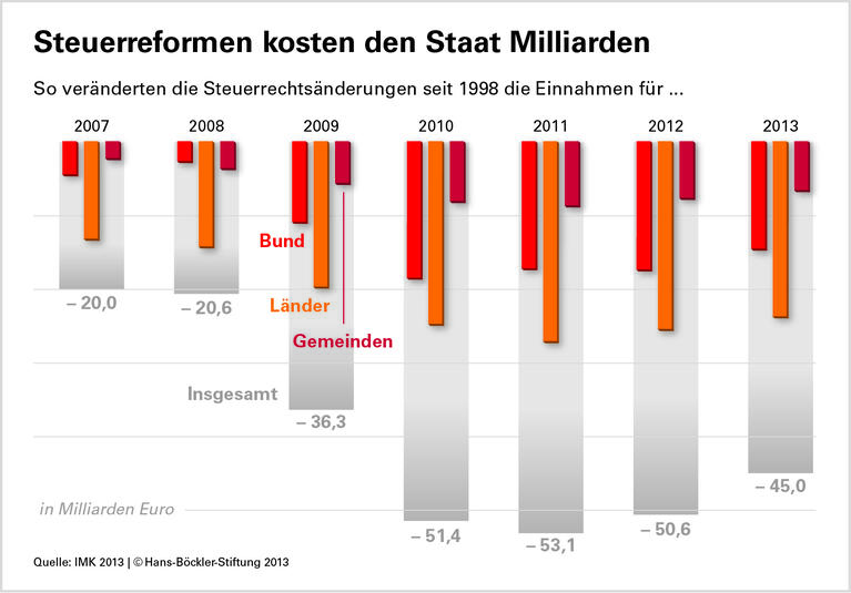 Als zweite Ursache für das Minus in den öffentlichen Kassen identifiziert die Forscherin die strukturellen Mindereinnahmen infolge von Steuersenkungen. Das lässt sich daran ablesen, dass die Steuereinnahmen hinter dem Wachstum des regionalen BIPs zurückgeblieben sind. Würden die Steuergesetze von 1998 noch gelten, würde das Land Rheinland-Pfalz allein in diesem Jahr 862 Millionen Euro mehr einnehmen. Das entspricht ungefähr dem strukturellen Defizit von rund 819 Millionen Euro im Landeshaushalt 2012. Die Kommunen müssen aufgrund der Steuerrechtsänderungen auf weitere 518 Millionen Euro verzichten. Insgesamt nimmt die öffentliche Hand in Rheinland-Pfalz 2013 also knapp 1,4 Milliarden Euro weniger ein.