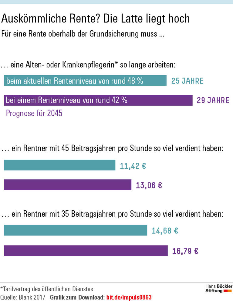 Beim aktuellen Rentenniveau von rund 48 Prozent des Durchschnittsentgelts erhält eine tariflich bezahlte Alten- oder Krankenpflegerin nach gut 25 Beitragsjahren eine Rente oberhalb der Grundsicherung im Alter. Würde dagegen bereits das für 2045 prognostizierte Rentenniveau von knapp unter 42 Prozent gelten, hätte sie erst nach rund 29 Beitragsjahren einen Rentenanspruch über der Grundsicherung.