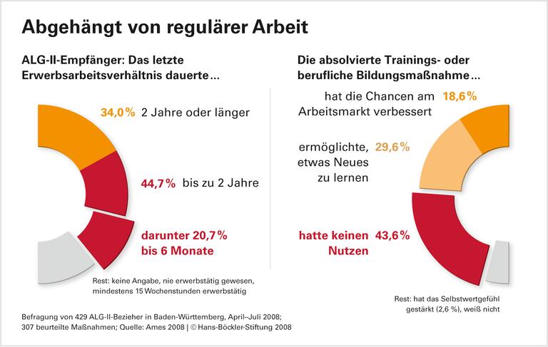 Nur wenige finden reguläre Arbeit. Was die Statistik als "Beendigung der Arbeitslosigkeit" erfasst, ist selten eine tatsächliche Integration ins normale Erwerbsleben. Wer von der Arbeitslosenliste gestrichen wird, hat meist keinen regulären Job gefunden, sondern verschwindet in der "Nichterwerbstätigkeit", nimmt an einem Training teil, macht einen Ein-Euro-Job, hat sich krank gemeldet oder wird vom Amt als "nicht verfügbar" eingestuft. So nahm laut Arbeitsagentur weniger als ein Drittel der ALG-II-Bezieher, die im Juli 2008 aus der westdeutschen Arbeitslosenstatistik ausgeschieden sind, eine Erwerbstätigkeit auf - viele als Ein-Euro-Jobber oder auf anderen geförderten Stellen. Die Befragung zeigt zudem, dass Integrationserfolge oft nicht von Dauer sind: Ein beträchtlicher Teil der ALG-II-Empfänger seien nicht langzeitarbeitslos, sondern immer abwechselnd kurzfristig beschäftigt und arbeitslos, schreibt Ames. Beispielsweise hatten 15 Prozent der Befragten in den letzten 12 Monaten ein Erwerbsarbeitsverhältnis, das nicht lange genug dauerte, um einen Anspruch auf Arbeitslosengeld I zu erwerben.