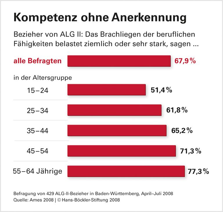 Fast zwei Drittel leiden stark unter dem Gefühl, ausgegrenzt zu sein. Rund 80 Prozent dieser ALG-II-Empfänger geben an, dass Geldnot ihnen sehr zu schaffen macht. Noch größer ist aber die Gruppe derer, die beklagt, dass sie keine Möglichkeit habe, "die eigenen Fähigkeiten einzusetzen". Die Wissenschaftlerin folgert: "Solche Befunde machen deutlich, wie wirklichkeitsfremd die wirtschaftswissenschaftlichen Hypothesen zur Motivation von Erwerbslosen sind", die davon ausgehen, dass Arbeitslose wegen des hohen "Freizeitnutzens der Erwerbslosigkeit" keine schlecht bezahlte Arbeit annehmen wollen.