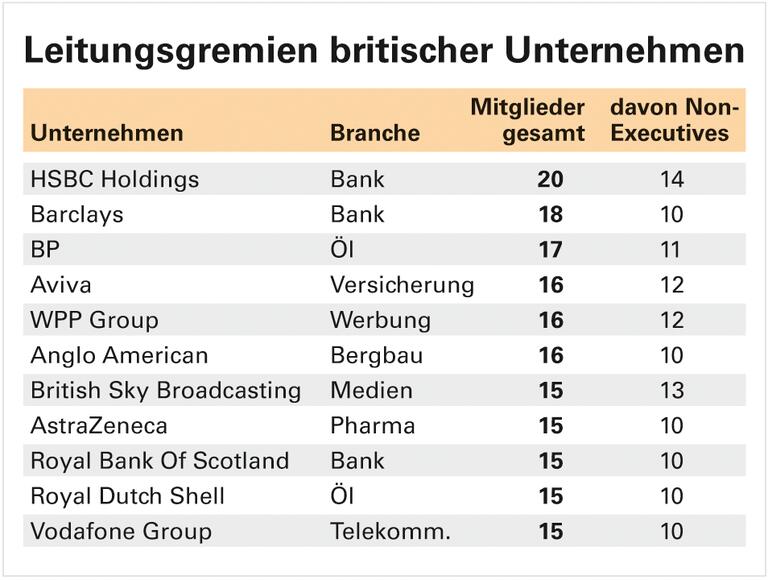 Kontrolle braucht Köpfe. Auch ohne die Unterteilung in Vorstand und Aufsichtsrat - klein sind die Leitungsgremien britischer Großunternehmen nicht gerade.