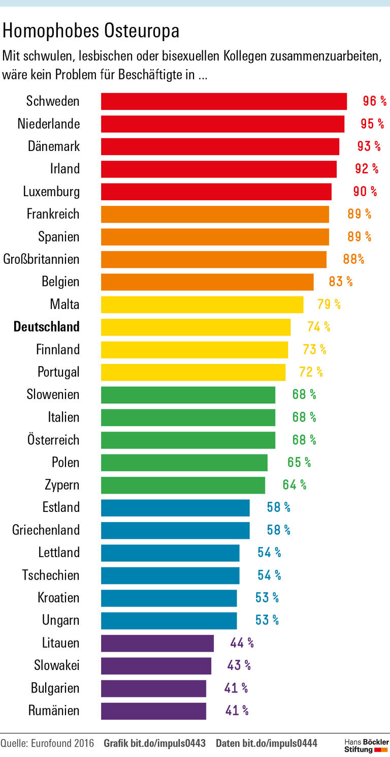 Ein ähnliches Muster offenbart eine Umfrage der EU-Agentur für Grundrechte unter Angehörigen sexueller Minderheiten aus dem Jahr 2012. Europaweit gab fast ein Fünftel der Befragten an, in den vergangenen zwölf Monaten bei der Arbeit diskriminiert worden zu sein. Am geringsten war der Anteil mit elf Prozent in Dänemark. In Zypern, Lettland und Litauen war dagegen mehr als ein Viertel betroffen. Vor allem in vielen neuen Mitgliedsländern sei Homophobie offenbar ein gravierendes Problem, schreiben die Autoren. Auch wirtschaftlich sei das fatal: Einer irischen Studie zufolge hat Mobbing bei einem Zehntel der LGBT-Arbeitnehmer Fehltage verursacht.
